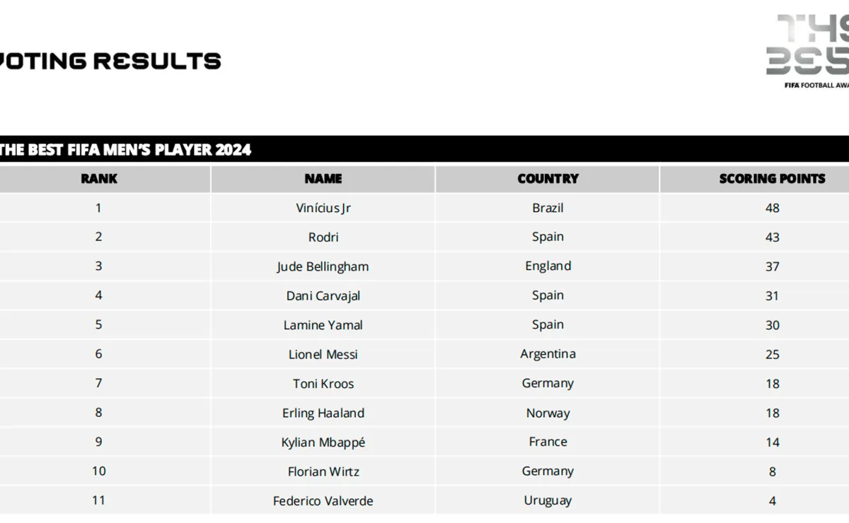 Vinicius superó a Dani Carvajal, Erling Haaland, Federico Valverde, Florian Wirtz, Jude Bellingham, Kylian Mbappé, Lamine Yamal, Lionel Messi, Rodri y Toni Kroos, y se convirtió en el primer brasileño que gana el premio que se entrega desde el 2016 como competencia del Balón de Oro.