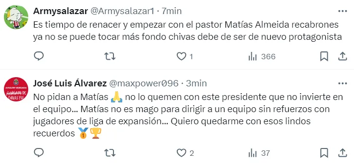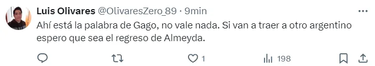 Luego de oficializar la salida de Gago a través de las redes sociales, la publicación se llenó de comentarios de hinchas de Chivas pidiendo el regreso de Matías Almeyda. Cabe recordar que el Pelado pasó por el conjunto de Guadalajara entre 2015 y 2018 dejando una huella imborrable con la conquista de cinco títulos, entre los que se destacan una Liga Mexicana en 2017 y la Liga de Campeones de la Concacaf en 2018.