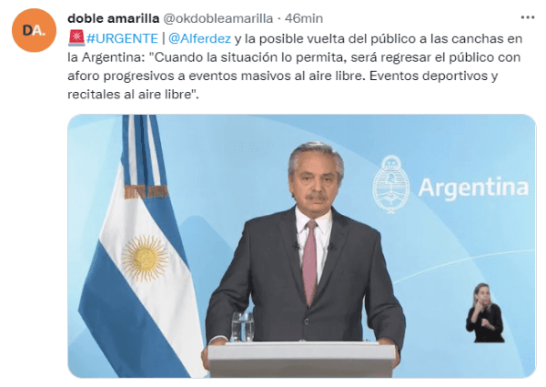 Durante el discurso presidencial de Alberto Fernández en las primeras horas del día, el mandatario se refirió a la posibilidad del regreso de los hinchas y dio enormes noticias para el fútbol argentino.“El siguiente paso será regresar el público a eventos deportivos al aire libre, recitales al aire libre. Podrá haber viajes grupales de personas mayores que tengan el esquema completo de vacunación”, declaró el Presidente en el anuncio del Plan de Recuperación Responsable.