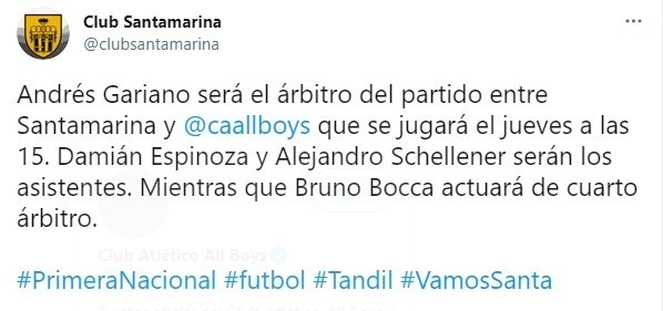 En lo que es la continuidad de la duodécima fecha de laPrimera Nacional, más precisamentedentro de laZona B, Santamarinaestará recibiendo a All Boysestejueves 17 de juniodesde elEstadio Municipal General San Martínde Tandila las 15:00 hora local.El juego será transmitidoEN VIVO Y EN DIRECTOa través de la plataforma TyC Sports Play.