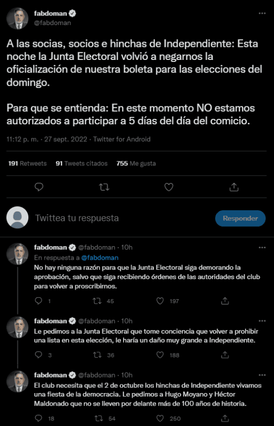 “A las socias, socios e hinchas de Independiente: Esta noche la Junta Electoral volvió a negarnos la oficialización de nuestra boleta para las elecciones del domingo. Para que se entienda: En este momento NO estamos autorizados a participar a 5 días del día del comicio”, escribió el periodista en su cuenta de Twitter.