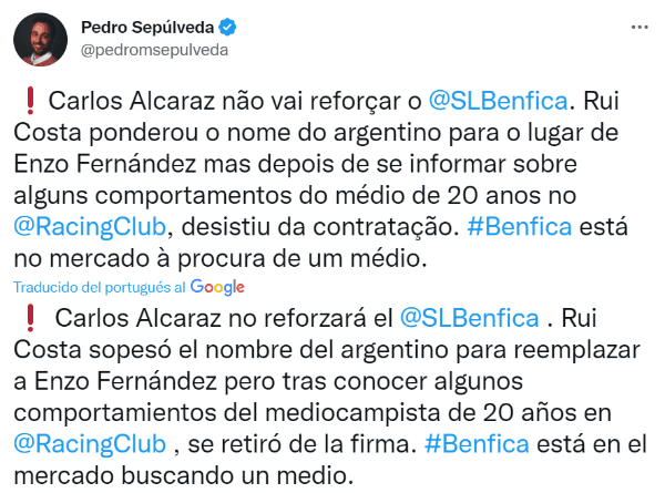 A lo largo de los últimos días, muchísimo se habló de la chance de que Benfica fuera detrás de los pasos de Carlos Alcaraz si es que vendían a Enzo Fernández a Chelsea. Pero en la jornada de este martes, desde Portugal afirmó el periodista Pedro Sepúlveda que las Águilas se bajaban de la posible negociación debido a los problemas de conducta del mediocampista nacido en La Plata.