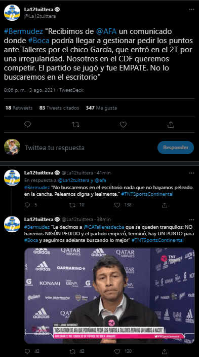 “Le decimos a Talleres que se queden tranquilos.Noharemos ningún pedido;el partido empezó, terminó, hay un punto para Boca y seguimos adelante buscando lo mejor”, cerró Bermúdez. La situación refiere al ingreso de Diego García, el uruguayo ex Estudiantes de La Plata.