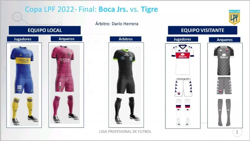A pesar de que se creía que Boca podía llegar a utilizar la camiseta amarilla, la Liga Profesional informó que el Xeneize seguirá portando la titular (azul y amarilla), mientras que Tigre llevará la blanca alternativa.
