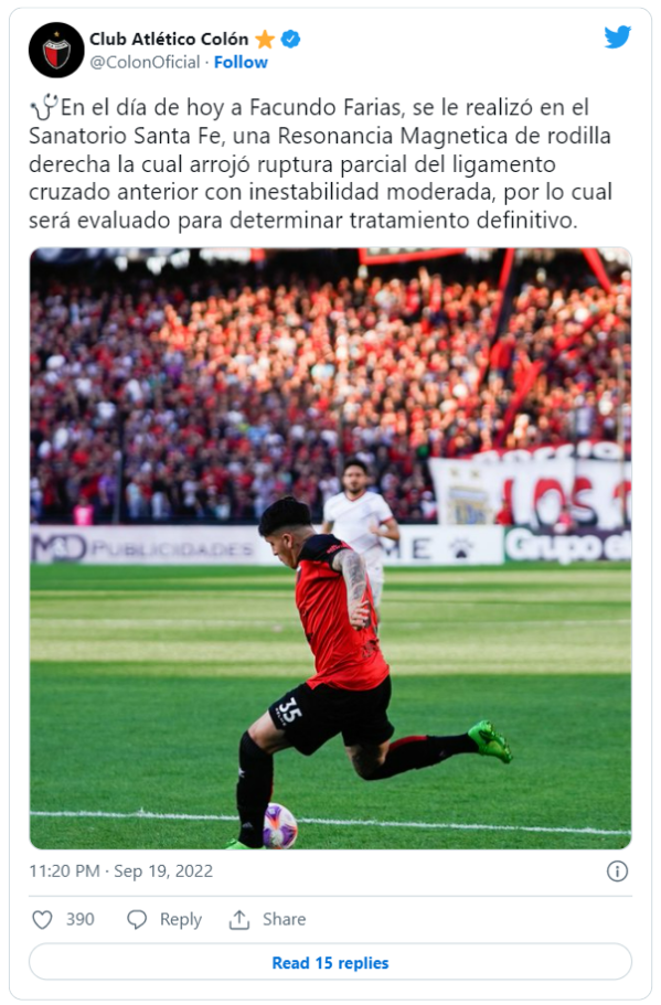 De esta manera, el pibe de 20 años deberá pasar por el quirófano y estará afuera de las canchas, como mínimo, por seis meses. Sin lugar a dudas, una noticia durísima para Colón y para el fútbol argentino. ¡Pronta recuperación, Facu!