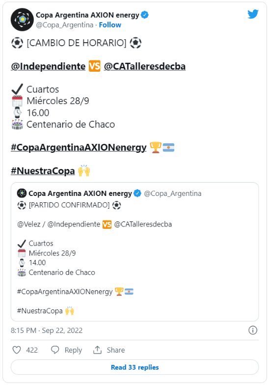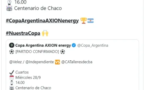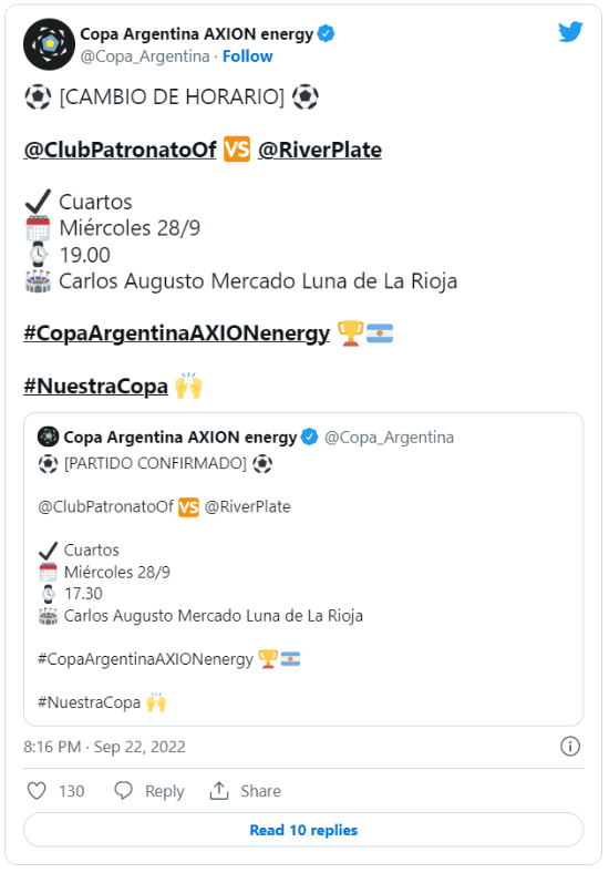 La semana que viene tendremos una jornada de mucha acción en la Copa Argentina. Salvo Banfield-Godoy Cruz (juegan el martes), tres duelos de cuartos de final se disputarán el miércoles 28 en diferentes puntos del país: Independiente-Talleres, River-Patronato y Boca-Quilmes. Por eso, se defineron cambios en los horarios.