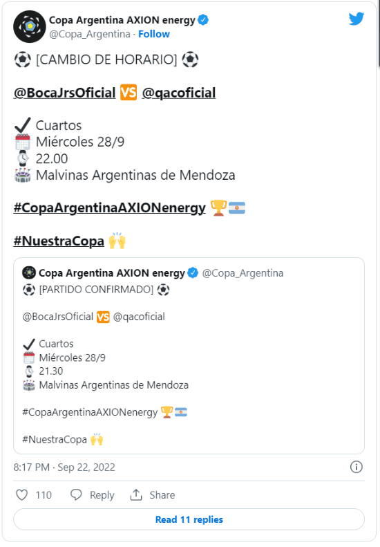 El Xeneize jugará después ante Quilmes, en un duelo que se iba a disputar a las 21:30 y se pasó para las 22. Los dirigidos por Hugo Ibarra jugarán por segunda vez en Mendoza en la misma semana, ya que ahora se encuentran allí para medirse ante Godoy Cruz por la Liga Profesional.