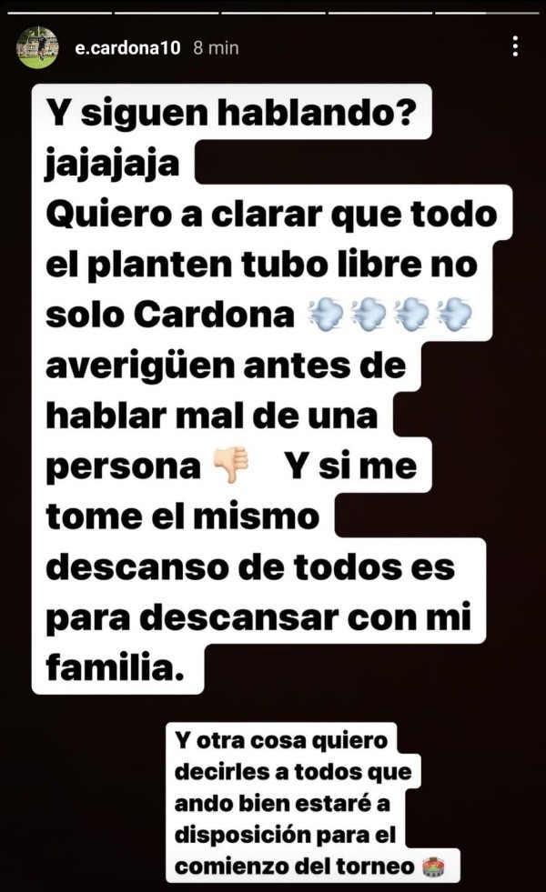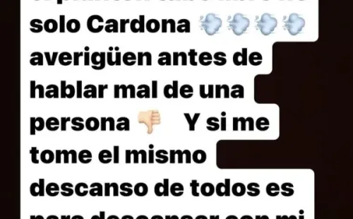 Cansado de las opiniones ajenas, el ex Atlético Nacional apareció en sus redes sociales y publicó un mensaje en el que disparó contra todos aquellos que se obsesionaron con su falta de disciplina: “¿Y siguen hablando? Jaja. Quiero aclarar que todo el plantel tuvo libre, no solo Cardona. Averigüen antes de hablar mal de una persona. Y sí, me tomé el mismo descanso que todos, es para descansar con mi familia”, escribió en una historia de Instagram.