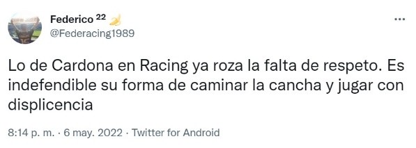 Racing rescató un empate frente a San Lorenzo, se clasificó primero en el Grupo A de la Copa LPF y ahora espera por el rival que enfrentará en Cuartos de Final. Pero más allá de lo que fue el juego ante el Cuervo, los hinchas dispararon con munición pesada contra el rendimiento de Edwin Cardona.