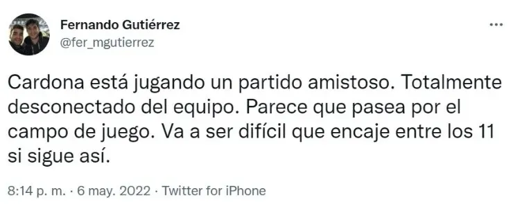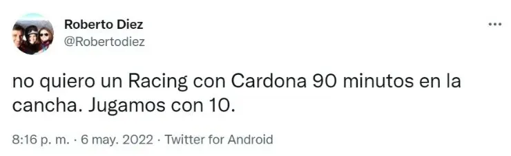 Desde el cuerpo técnico que comanda Fernando Gago pretenden que Cardona siga reduciendo su peso para que su rendimiento se eleve y se transforme en una pieza fundamental para la Academia. Por eso mismo, y a pesar de las críticas de los hinchas, le prepararán una pretemporada diferente al resto.