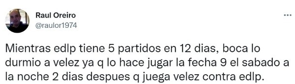 El argumento que presentaron Jorge Amor Ameal y Juan Román Riquelme explica que los dirigidos por Battaglia tendrán el segundo compromiso por la Libertadores el martes 12 de abril, en La Bombonera, frente a Always Ready. Además de que indicaron en AFA que Vélez llegaría con mayor descanso para el choque copero ante Red Bull Bragantino, que se disputará el jueves 14.
