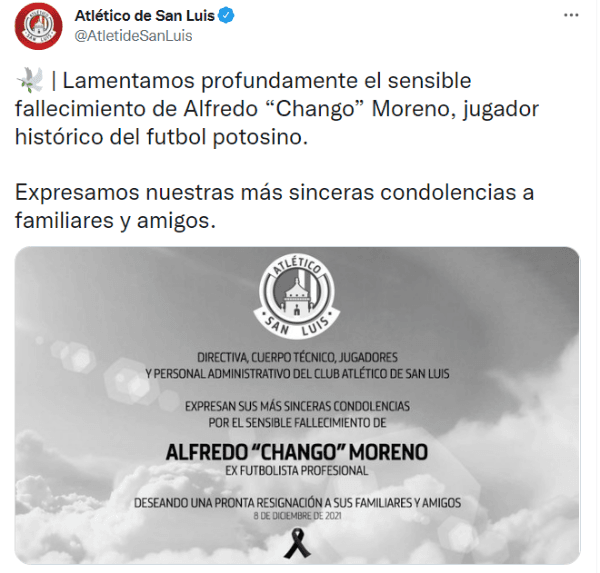 Con 41 años de edad, el santiagueño Alfredo Moreno falleció mientras se encontraba internado en la lucha contra el tumor. Así lo confirmó el club San Luis, quien envió su pésame a la familia del “Chango” mediante un comunicado en redes sociales. “Lamentamos profundamente el sensible fallecimiento de Alfredo “Chango” Moreno, jugador histórico del futbol potosino. Expresamos nuestras más sinceras condolencias a familiares y amigos”, escribió el club mexicano. Los equipos que agasajaron al delantero seguramente se sumarán en las próximas horas al duelo tras la pérdida física de Moreno.