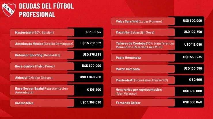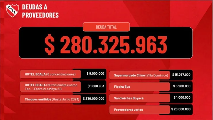 Pasando ya el primer mes de gestión de la agrupación Unidad Independiente, en el Estadio Libertadores de América Ricardo Bochini mostraron la crítica situación financiera del club y en dicha presentación se vieron algunas deudas insólitas, mientras que otras ya se conocían. Entre ellas, aparece un debe con Boca que tienen pendiente desde hace años.