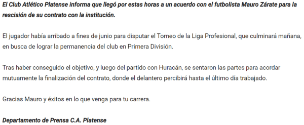 A través de un comunicado, sentenciaron que “el Club Atlético Platense informa que llegó por estas horas a un acuerdo con el futbolista Mauro Zárate para la rescisión de su contrato con la institución. El jugador había arribado a fines de junio para disputar el Torneo de la Liga Profesional, que culminará mañana, en busca de lograr la permanencia del club en Primera División”.