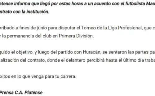 Además de notificar la decisión, en Platense dieron a conocer cómo fue la negociación para llegar a la rescisión contractual del ex Boca: “Tras haber conseguido el objetivo, y luego del partido con Huracán, se sentaron las partes para acordar mutuamente la finalización del contrato, donde el delantero percibirá hasta el último día trabajado. Gracias Mauro y éxitos en lo que venga para tu carrera”, manifestaron.