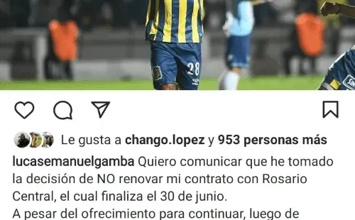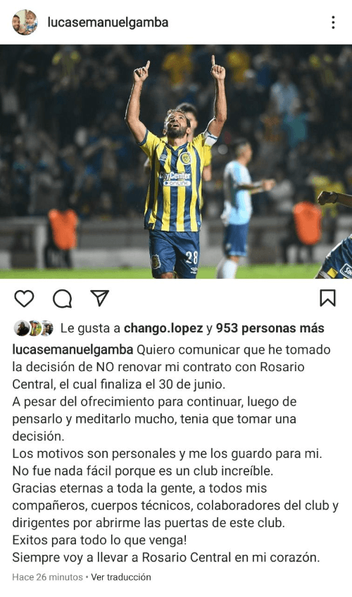 “Quiero comunicar que he tomado la decisión de NO renovar mi contrato con Rosario Central”, expresó el delantero en su cuenta de Instagram, confirmando que se irá el próximo 30 de junio, y agregó: “A pesar del ofrecimiento para continuar, luego de pensarlo y meditarlo mucho, tenía que tomar una decisión. Los motivos son personales y me los guardo para mí”.