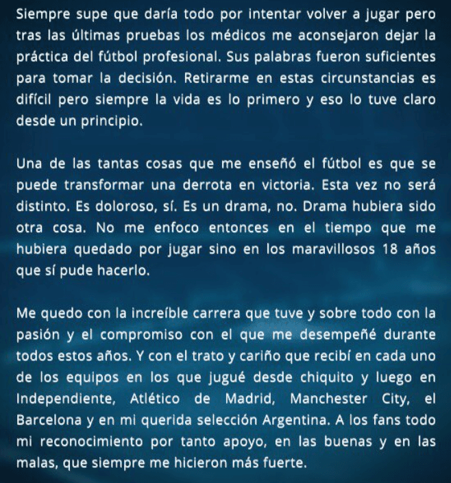 Luego del susto por su problema cardíaco, el Kun sabe que fue una desgracia con suertes: “Una de las tantas cosas que me enseñó el fútbol es que se puede transformar una derrota en una victoria. Esta vez no será distinto. Es doloroso, sí. Es un drama, no. Drama hubiera sido otra cosa”. Y continuó: “No me enfoco entonces en el tiempo que me hubiera quedado por jugar sino en los maravillosos 18 años que sí pude hacerlo”.