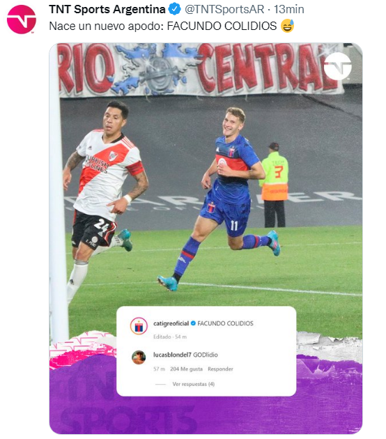 La cuenta oficial de Tigre celebró su gol en Instagram y lo hizo bautizando al jugador con un divertido apodo que tuvo banca entre los simpatizantes: “Colidios”. En los comentarios, el futbolista del Matador, Lucas Blondel, decidió redoblar la apuesta y le puso otro alias. “Godlidios”, en referencia a la palabra de moda entre los jóvenes para resaltar una figura. Momento de ensueño para el pibe.