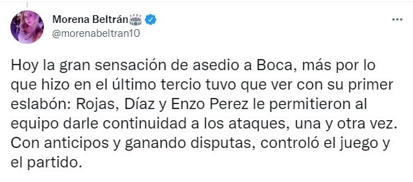 Tras esto, completó: “Hoy la gran sensación de asedio a Boca, más por lo que hizo en el último tercio tuvo que ver con su primer eslabón: Rojas, Díaz y Enzo Perez le permitieron al equipo darle continuidad a los ataques, una y otra vez. Con anticipos y ganando disputas, controló el juego y el partido”.