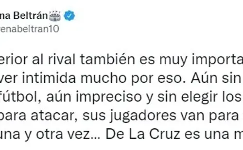 En este contexto, la periodista Morena Beltrán utilizó su cuenta de Twitter, desde donde suele analizar partidos nacionales e internacionales con mucha precisión, para brindar su postura respecto al triunfo del equipo de Marcelo Gallardo.