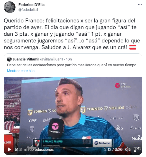 Quien salió al cruce en redes sociales a raíz de las declaraciónes de Armani fue Federico D’Elia, mayormente conocido como el actor que le dio vida al personaje de Mario Santos en “Los Simuladores”, entre otros grandes trabajos. El reconocido hincha de Estudiantes replicó el video en donde el arquero de River hablaba del planteo del Pincha y escribió: “El día que digan que jugando ‘así’ te dan 3 puntos por ganar y jugando ‘asá’ 1 punto por ganar, seguramente jugaremos ‘así’ o ‘asá’, depende lo que nos convenga”. Fiel a la escuela de Zubeldía y Bilardo.