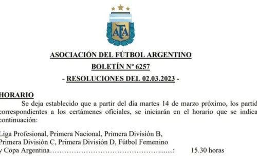 La misma, es referida al cambio de horarios, pasando del horario de verano al de invierno, por lo que los partidos comenzarán a partir de las 15: 30 y no a las 17:00, como viene pasando en el transcurso del torneo y comenzará a regir a partir del 14 de marzo, previo a la fecha 8 de esta Liga Profesional, que arranca el viernes 17.