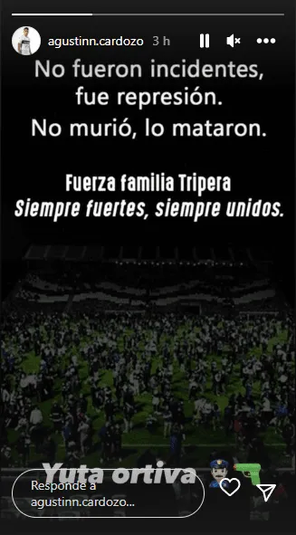 Haciendo referencia alfallecimiento de César Regueiro,Cardozoaseguró: “No murió, lo mataron”. Y cerró su mensaje en historias de Instagram: “Fuerza familia tripera. Siempre fuertes, siempre unidos. Yuta ortiva”. Sin titubeos.