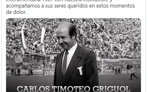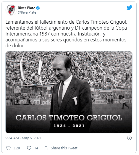 River Plate, uno de los clubes por los que tuvo un corto paso en el banco de suplentes, lo recordó y le dedicó unas palabras en su cuenta de Twitter: “Lamentamos el fallecimiento de Carlos Timoteo Griguol, referente del fútbol argentino y DT campeón de la Copa Interamericana 1987 con nuestra Institución, y acompañamos a sus seres queridos en estos momentos de dolor”.