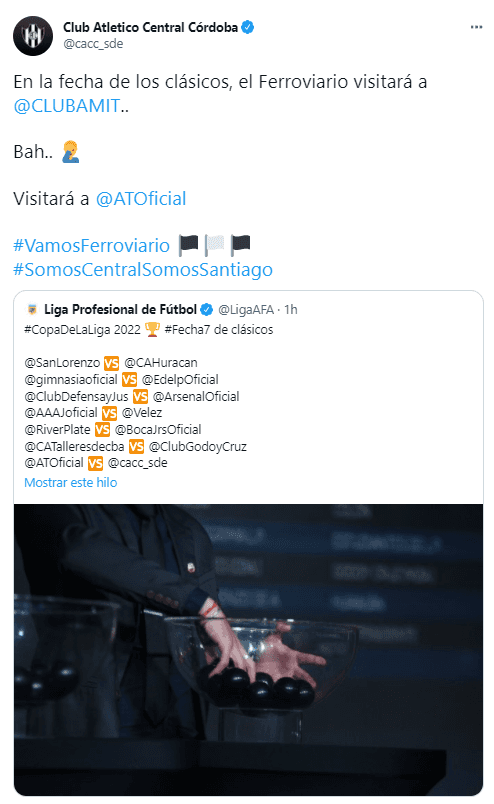 Minutos después de la finalización del sorteo, el encargado de las redes de Central Córdoba de Santiago del Estero apareció con un un “verdadero tuitazo”, según los hinchas. Un poco de folclore. Picardía sana y cargada a los de enfrente.