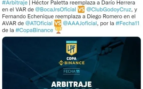 Mediante sus redes sociales, la Liga Profesional comunicó un sorpresivo cambio y finalmente será Héctor Paletta el responsable de la sala del VAR en lugar de Herrera, aunque no dio mayores explicaciones.
