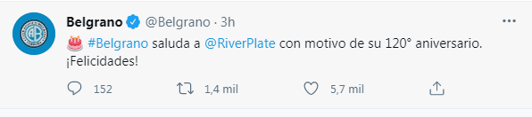 “Belgrano saluda a River Plate con motivo de su 120º aniversario. ¡Felicidades!”, escribió el club cordobés. Un mensaje que repitió ante para el club millonario como para Platense y Defensores de Belgrano, que también celebran sus respectivos cumpleaños en este día patrio.