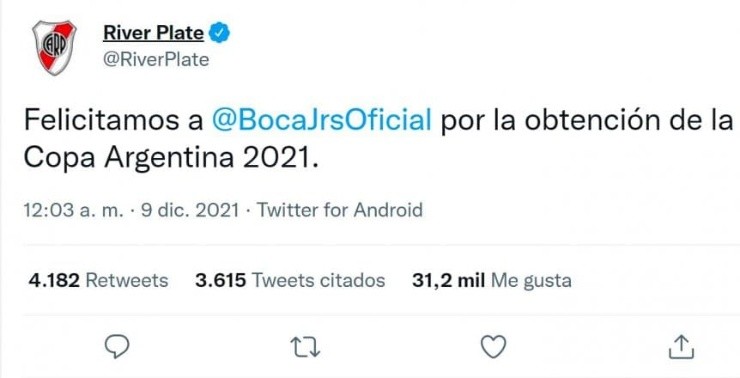 Cuando el Xeneize obtuvo la Copa Argentina, desde la cuenta oficial de Twitter del Millonario publicaron un correcto mensaje: “Felicitamos a Boca Juniors por la obtención de la Copa Argentina 2021”, indicó el tuit. Y lo curioso fue que lo hicieron a las 00:03 del 9 de diciembre, fecha histórica para River por la consagración frente al Xeneize en la Copa Libertadores.