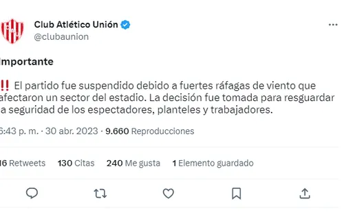 En sus redes sociales, la cuenta oficial de Unión publicó un comunicado al respecto: “El partido fue suspendido debido a fuertes ráfagas de viento que afectaron un sector del estadio. La decisión fue tomada para resguardar la seguridad de los espectadores, planteles y trabajadores”.