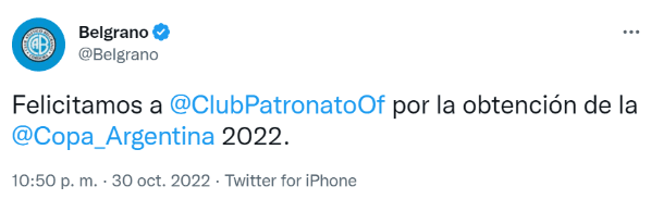Era de esperarse que desde la cuenta oficial de Belgrano apareciera algún tipo de mensaje para con los de Paraná, o incluso para su clásico rival, que se quedó con las manos vacías por segunda edición consecutiva (NdR: en 2021 perdió por penales ante Boca). Y con simpleza, el conjunto cordobés que retornó a la Liga Profesional, le envió sus felicitaciones a los comandados por Facundo Sava.
