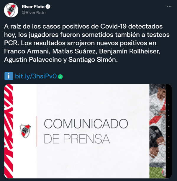 Enrique Bologna, Germán Lux, Franco Petroli, Paulo Díaz, Robert Rojas, Bruno Zuculini, Tomás Castro Ponce, Nicolás De La Cruz, Rafael Santos Borré y Federico Girottidieron positivo de COVID-19, por lo que quedaron inmediatamente descartados del Superclásico frente al rival de toda la vida. Un auténtico baldazo de agua fría para el Millonario.