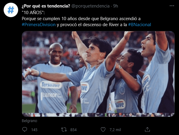 Hoy se cumplen diez años de ese momento, por lo que no fue excepción el recuerdo en las redes sociales sobre lo sucedido, a tal punto que apenas comenzó el día ya era tendencia en Twitter la frase “10 años“. Así mismo, también lo fueron “Felices 10″ y “Monumental“, por el lugar donde se dio el descenso.
