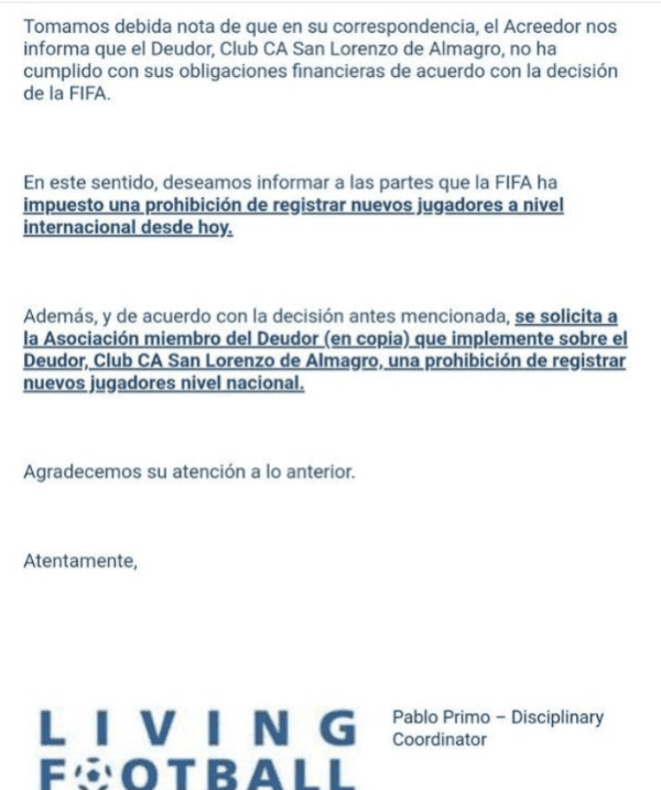 Una peor que otra para San Lorenzo. Tras la derrota del lunes ante Talleres en Córdoba por 2-0 que lo dejó flotando en la mitad de la tabla de la Liga Profesional de Fútbol, y los problemas entre jugadores y allegados en pleno aeropuerto volviendo, llegó un bombazo desde FIFA.