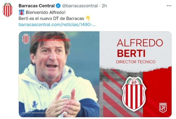 El santafesino de 50 años quedó confirmado como el nuevo entrenador del recientemente ascendido, y así lo manifestó el presidente del Guapo:“Después de una reunión y una linda charla con Berti, definimos que sea él quien conduzca nuestro primer equipo de aquí hasta diciembre y no tengo dudas que juntos vamos a lograr el objetivo”, indicó en su cuenta de Twitter.