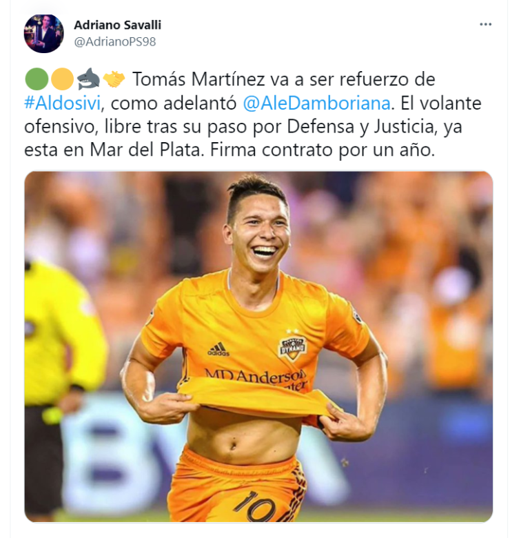 Luego de ser considerado una de las promesas más grandes del fútbol argentino, Tomás Martínezemigró a España en 2015 para vestir la camiseta del Tenerife. Allí comenzó su carrera de trotamundo que hoy lo llevaría a defender los colores de Aldosivi: de Tenerife a Defensa y Justicia, luegoSporting Braga yHouston Dynamo. Y luego de cuatro temporadas en Estados Unidos, retornó al Halcón y quedó con el pase en su poder.