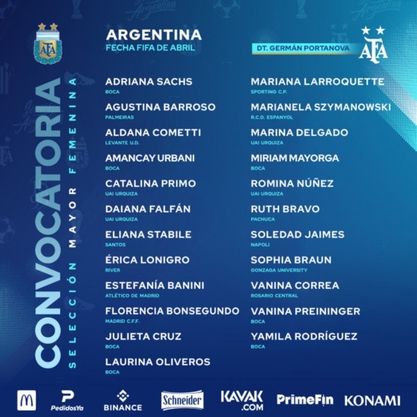 Entre las convocadas que también retornarán a la celeste y blanca en esta convocatoria están la central de Boca Adriana Sachs yAgustina Barroso quien se perdió los partidos con Colombia por dar positivo de COVID. Son siete convocadas de Boca, cuatro de UAI Urquiza, una de River y una de Rosario Central. El resto de las jugadoras que conforman la lista viajarán desde el exterior.