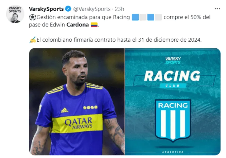 Según aseguran fuentes cercanas a la Acadé, sólo restan detalles para la llegada de Cardona, quien tiene ganas de tener revancha en el fútbol argentino y es prioridad uno para el técnico. Mientras que, por el lado de Caco, las negociaciones están más frías. Una vez definido el pase del colombiano, la CD de Racing analizará el tema Centurión, quien comenzará a entrenar con el plantel a la espera de otras ofertas (Newell’s lo querría).