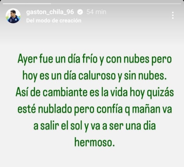 “Ayer fue un día claro y con nubes pero hoy es un día caluroso y sun nubes. Así de cambiante es la vida, hoy quizá esté nublado pero confiá en que mañana va a salir el sol y va a ser un día hermoso”, escribió. ¿Qué pasará con él?