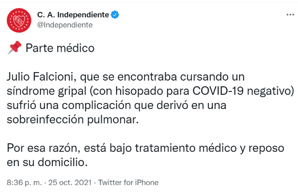 En el cierre de la jornada 18 de la Liga Profesional, Independiente recibió a Unión en el Libertadores de América y sin la presencia de Julio César Falcioni, quien se ausentó por un fuerte cuadro gripal que derivó en una infección pulmonar.
