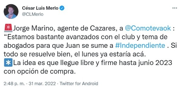 A poco de concretarse la negociación, quien rompió el silencio fue Daniel Montenegro, el mánager de Independiente:“Estamos tratando de llegar a un acuerdo por Cazares, pero sin hacer locuras. Eso es lo que queremos controlar. Que Independiente no haga promesas que después no pueda cumplir”, explicó el Rolfi en diálogo con Radio Continental.