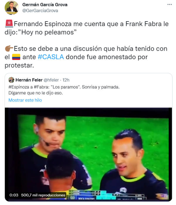 Es por eso que, a raíz de la circulación masiva de la cinta, el juez se habría comunicado con el periodista Germán García Grova para aclarar lo sucedido y ponerle fin a la polémica, al menos desde su posición. “Fernando Espinoza me cuenta que a Frank Fabra le dijo:’ Hoy no peleamos”, escribió el jornalista de TyC Sports a través de Twitter.