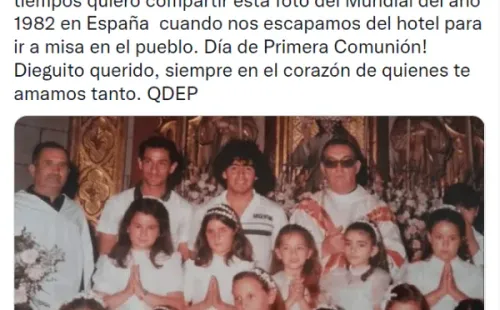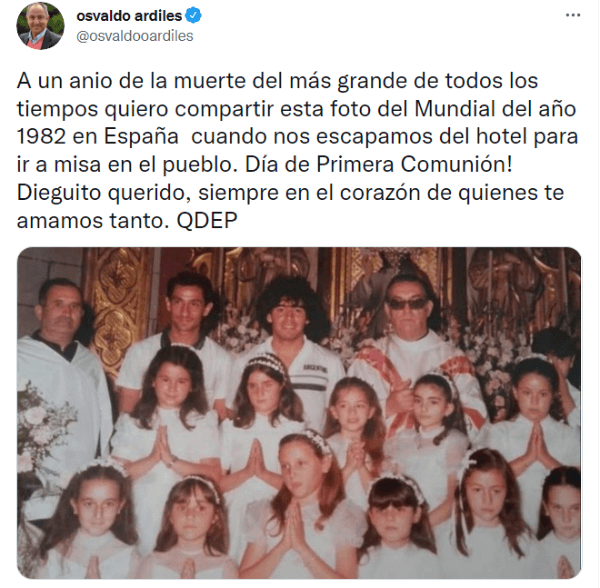 En la imagen se los ve a ambos posando en una iglesia cercana a la concentración de la Albiceleste en suelo europeo y Ardiles revivió una anécdota desconocida hasta el día de hoy para recordar a Pelusa de la mejor manera posible. “A un año de la muerte del más grande de todos los tiempos quiero compartir esta foto del Mundial del año 1982 en España, cuando nos escapamos del hotel para ir a misa en el pueblo. ¡Día de Primera Comunión! Dieguito querido, siempre en el corazón de quienes te amamos tanto. QDEP”, escribió la gloria del Tottenham. De crack mundial a crack mundial.
