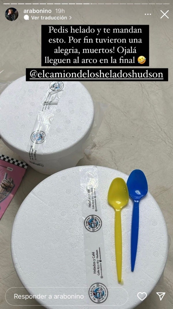 A través de Instagram, la esposa del delantero, Araceli Bonino, compartió una historia en donde se observan dos potes de helado y también dos cucharitas plásticas. Y allí estuvo la chicana de la que se quejó tras publicar la imagen: “Pedís helado y te mandan esto. ¡Por fin tuvieron una alegría, muertos! Ojalá lleguen al arco en la final”, escribió. Pero ¿por qué tanto lío con las cucharas? Tenían los colores de Boca.