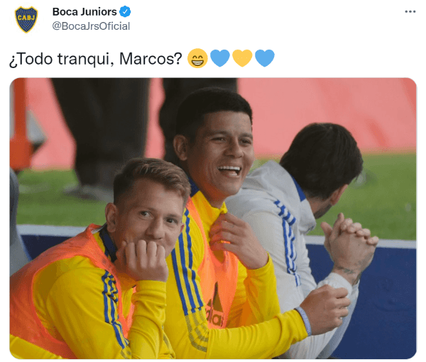 Mediante la cuenta oficial de Twitter, el Community Manager de Boca aprovechó el momento y, apenas terminó el encuentro en el Monumental, salió al cruce con una foto de Marcos Rojo a pura carcajada. Y a ello le añadió un texto muy sutil: “¿Todo tranqui, Marcos?”, escribió.