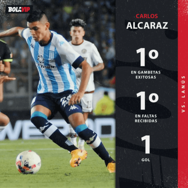 No jugó bien. Racing, principalmente en el segundo tiempo, se vio superado por Lanús pero, cuando más sufría, contó con un tanto inesperado pero muy necesario: el tiro libre de Carlos Alcaraz. Sobre el minuto 87, agarró la pelota y sorprendió a Lautaro Morales, arquero visitante, que no llegó a reaccionar. Repasamos el partido del jugador de La Academia.