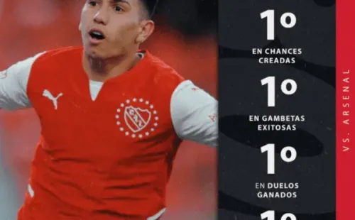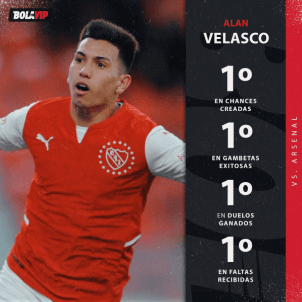Entre tantos puntos altos en Independiente, es inevitable mencionar el encuentro del 10: Alan Velasco. Inquieto, participativo, rápido, encarador. El volante ofensivo del Rojo estuvo enchufado a lo largo de todo el partido e hizo lo que quiso ante sus rivales. ¿Sus números?